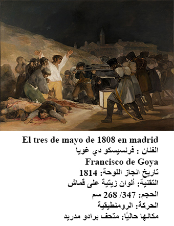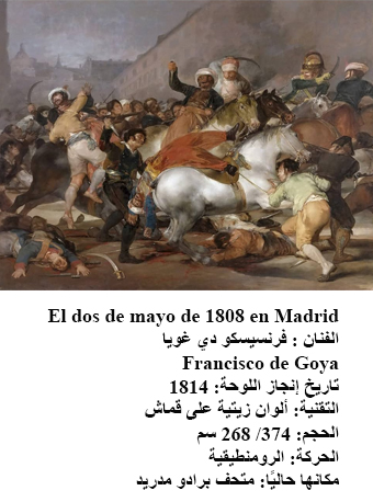 في اليوم 2 مايو السنة 1808 تمت الانتفاضة والمواجهة الضارية ضد الوجود الفرنسي على الأراضي الأسبانية، حيث انطلقت في شوارع مدريد مظاهرات سريعًا ما تحولت إلى معركة بين الأسبان والجيش الفرنسي (المتكون من عدة فصائل منهم “المملوكيين”) وهو موضوع اللوحة الأولى التي قدمها “غويا”، أين نستطيع رؤية هذه الواقعة.