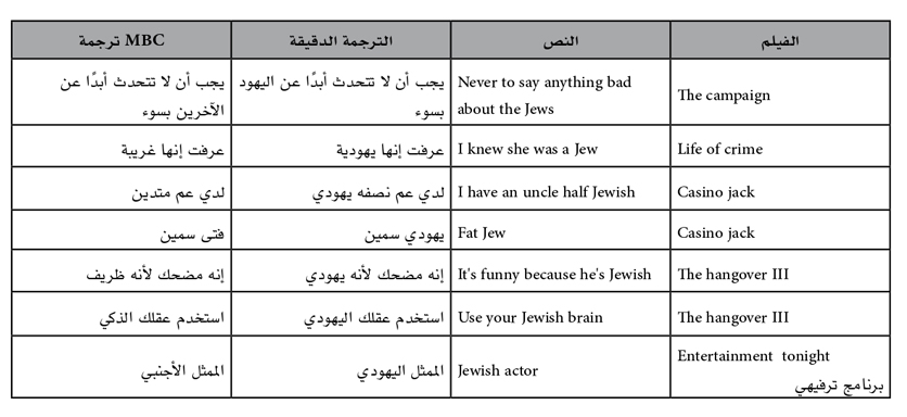 أحد الأمثلة الملفتة لهذا الحجب يظهر في الفيلم الأمريكي”The Campaign”، حيث يتحدث المرشح مارتي هقنز Marty Huggins في خطاب أمام الناخبين الأمريكيين عن نصيحة أبيه والتي يقول فيها “never say anything bad about the Jews” وترجمتها الحرفية “بأنك يجب أن لا تتحدث أبدًا عن اليهود بسوء”. ومع ذلك، ترجمت قناة MBC 2 هذا الجزء بـ”بأنك يجب أن لا تتحدث أبدًا عن الآخرين بسوء” حيث استبدل المترجم كلمة اليهود بكلمة الآخرين وهذا يغير المعنى الأصلي تمامًا خصوصًا إذا علمنا بأن هذه النصيحة حقيقة مشاهدة نشاهدها على التلفاز خلال الموسم الانتخابي الأمريكي عندما نرى حرص المرشح على دعم لجنة الشؤون العامة الأمريكية الإسرائيلية (الأيباك) وتأكيده على دعمه الكامل لحق إسرائيل في الوجود والدفاع عن حقها في البقاء. فهنا كان لزامًا على مترجمي MBC ذكر الترجمة الدقيقة وذكر كلمة اليهود في هذا السياق ليفهم المشاهد العربي مغزى الحوار.